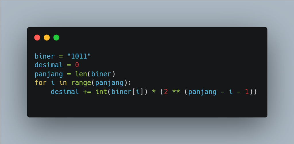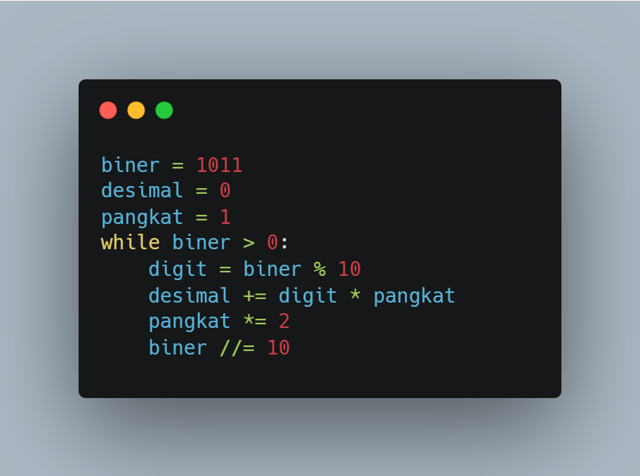 Konversi biner ke desimal sering digunakan sebagai latihan logika bagi pemula. Melalui proses ini, kamu akan belajar perulangan, operasi matematika, dan pengolahan string secara bersamaan.